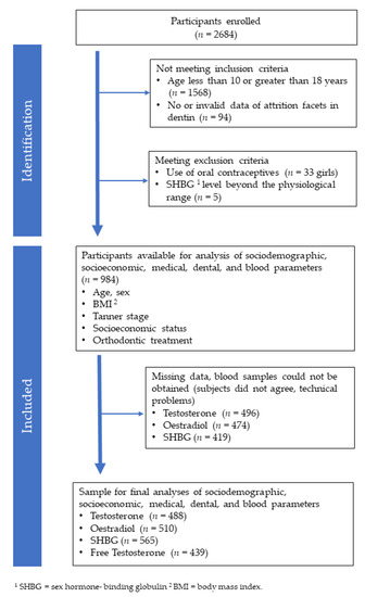 The LIFE Child study (clinical trial number: NCT02550236) is a part of the “Research Center for Civilization Diseases”, and it is a large epidemiological as well as population-based cohort study of the University of Leipzig. The dental examination was approved by the Ethics Committee of the University of Leipzig (registration number: 354-10-13122010), and it took place between May 2012 and August 2015. This study includes 1022 participants between the ages of 10 and 18 years (491 male, 531 female), who were medically and dentally examined [Figure 1]. From the total sample, 33 girls using oral contraceptives as well as 5 test persons comprising an invalid (out of range) sex hormone-binding globulin (SHBG) level were excluded. This resulted in a net sample of 984 children and adolescents (491 male, 493 female) for the final analyses of sociodemographic, socioeconomic, medical, and dental variables. Blood samples for analyses of hormone levels were further collected from 488 (247 male, 241 female) test persons providing the testosterone level, 510 (258 male, 252 female) test persons providing the oestradiol level, 565 (279 male, 286 female) test persons providing the SHBG level, and 439 (215 male, 224 female) test persons providing the level of free testosterone. The free androgen index was calculated from the testosterone level in nmol/l multiplied by 100 and then divided by the immunoassayed SHBG level in nmol/l [36].