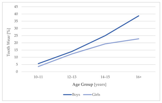 Many risk factors besides hormones can trigger bruxism. In a case-control study, a consideration of additional risk factors such as caffeine, alcohol, sleep problems, stress, or anxiety [34] would be relevant. However, recruiting subjects in a population study such as the present LIFE Child study ensures that all of these variables are randomly distributed [43,44]. Further, it is unlikely that those factors influence the association between tooth wear and hormones in the sense of a confounder. This would mean that caffeine influences the release of sex hormones. Indication for alcohol as a confounder of steroid hormones do exist, but limitation is given due to a very small study group (only 12 test persons), as carried out by Kumari et al. [64]. It is much more likely to expect an influence in subjects taking hormones (e.g., girls taking oral contraceptives). That is the reason those test persons were excluded from our survey, with age, sex, BMI, and orthodontic treatment essential influencing factors being considered in the survey. The present study observed that male children and adolescents are more often affected by tooth wear than female adolescents. This result corroborates the findings of Sousa et al., 2018 [17], Drumond et al. 2018 [14], Souto-Souza et al., 2020 [15], and Guo et al., 2018 [16]. The difference in sex distribution develops first in adolescence as seen in Figure 2. Data on the frequency and the prevalence described by Sousa [17] go hand in hand with our results. Sousa described a frequency rate of 22.2% in adolescents. In the present study, a percentage of 15.3 among all participants aged between 10 and 18 was described. Within the 10- to 13-year-old children, 9.4% were affected by tooth wear, whereas it applied to 25.5% of youth aged 14 and older.