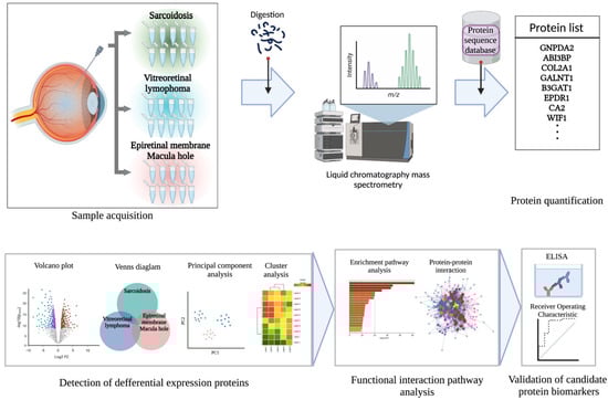 Figure 1. Schematic overview of the present study. Vitreous samples were collected from 10 patients with ocular sarcoidosis, 10 with vitreoretinal lymphoma (VRL), and 10 controls with epiretinal membrane or macular hole. Vitreous samples were pretreated by enzyme digestion, and peptide fragments were detected using liquid chromatography–mass spectrometry. Proteins were identified using a protein sequence database. Next, to detect differential expression proteins among the diseases, various analyses comprising Venn diagram, volcano plot, principal components analysis, and clustering analysis were performed. Functional interaction pathway analyses were conducted to further identify candidate biomarkers. Then, candidate protein biomarkers for ocular sarcoidosis were validated using ELISA to measure protein concentrations in vitreous samples of patients.