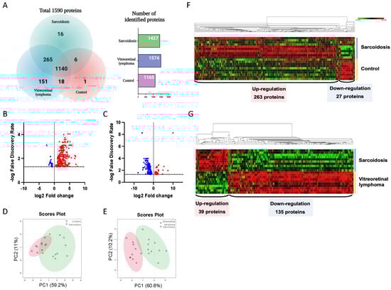 Figure 2. Identification of differential expression proteins. A total of 1590 proteins were detected in this study. Of these, 1140 were common proteins detected in ocular sarcoidosis, vitreoretinal lymphoma (VRL), and controls, whereas 16 proteins were detected only in ocular sarcoidosis and 151 proteins only in VRL (A). Differential expression proteins (DEPs) were defined as FDR−adjusted p value less than 0.05. The volcano plot showed that 290 and 174 proteins were upregulated (red) or downregulated (blue) compared with controls (B) and VRL (C), respectively. Principal component analysis visually depicted clear separation of ocular sarcoidosis from controls (D) and VRL (E). Hierarchical clustering showed that 263 proteins were upregulated while 27 were downregulated in the vitreous in ocular sarcoidosis compared with controls (F), whereas 39 proteins were upregulated and 135 were downregulated in ocular sarcoidosis compared with VRL (G).