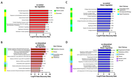 Figure 3. Top 10 altered REACTOME pathways in ocular sarcoidosis identified by enrichment pathway analysis. Biological REACTOME pathways in vitreous samples of ocular sarcoidosis patients were significantly upregulated or downregulated compared with controls (A,C), and with vitreoretinal lymphoma (B,D). The main pathway that branches into the detailed pathway is shown on the left of each bar chart. The numbers next to the bars indicate the number of proteins found in that pathway. A gradient associated with the -log10 false discovery rate depicts the red and blue bar colors.