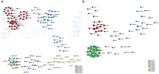 In the second part of our analysis, we aimed to identify the molecular pathways in which each DEP plays a functional role. Detailed analysis of the top 10 pathways associated with the DEPs in ocular sarcoidosis compared with controls and VRL was performed by conducting a search using the Reactome pathway. As shown in Figure 3, among the pathways associated with DEPs in ocular sarcoidosis compared with controls, the “neutrophil granulation” pathway was the most significantly upregulated in ocular sarcoidosis (Figure 3A). Of note, 8 of the top 10 detailed pathways belonged to the main pathway of “Immune system”. In the comparison with VRL, the “Transport of gamma-carboxylated protein precursors from the endoplasmic reticulum to the Golgi apparatus” pathway was the most significantly upregulated pathway in ocular sarcoidosis (Figure 3B). In addition, the top three detailed pathways were included in the main pathway of “Metabolism of proteins”. As for the pathways which were downregulated in ocular sarcoidosis, “Collagen chain trimerization” and “Apoptosis” were the most downregulated pathways compared with controls and VRL, respectively (Figure 3C,D). Protein–protein interaction networks for the DEPs identified in ocular sarcoidosis compared with controls and VRL were visualized using Metascape. The Molecular Complex Detection (MCODE) algorithm was applied to identify densely connected network components. MCODE enrichment analysis based on PPI enrichment analysis for DEPs in ocular sarcoidosis compared with controls showed eight PPI modules (Figure 4A; details listed in Table S4). In particular, the top enrichment term of MCODE1 included 42 proteins distributed in three major clusters of “Neutrophil degranulation”, “Platelet degranulation”, and “Response to elevated platelet cytosolic Ca2+”. When compared with VRL, MCODE enrichment analysis showed five PPI modules (Figure 4B; details listed in Table S4). The top enrichment terms of MCODE1 for DEPs in ocular sarcoidosis compared with VRL included 22 proteins distributed in three major clusters of “Glycolysis and gluconeogenesis”, “Metabolism of carbohydrates”, and “Carbon metabolism”. These results of molecular pathway and PPI network analyses for DEPs in ocular sarcoidosis compared with control and VRL suggest that these DEPs may be deeply involved in the pathogenesis of ocular sarcoidosis.