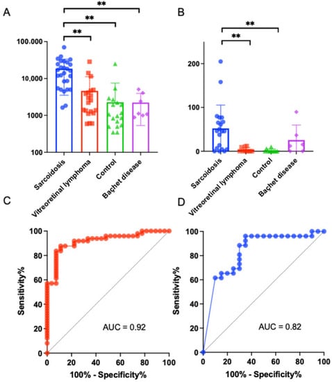 Figure 5. Validation for neutrophil gelatinase-associated lipocalin (NGAL) and junctional adhesion molecule B (JAMB) in vitreous samples as biomarkers for ocular sarcoidosis, using vitreous samples from various diseases. Enzyme-linked immunosorbent assay showed that vitreous NGAL concentration in sarcoidosis increased significantly compared to vitreoretinal lymphoma, controls, and Behçet’s disease (A), and vitreous JAMB concentration in ocular sarcoidosis increased significantly compared to vitreoretinal lymphoma and controls, but no significant difference compared to Behçet’s disease (** p < 0.01) (B). The receiver operating characteristic (ROC) curves of NGAL (C) and JAMB (D) showed large areas under the ROC curves (AUC) specific to ocular sarcoidosis.