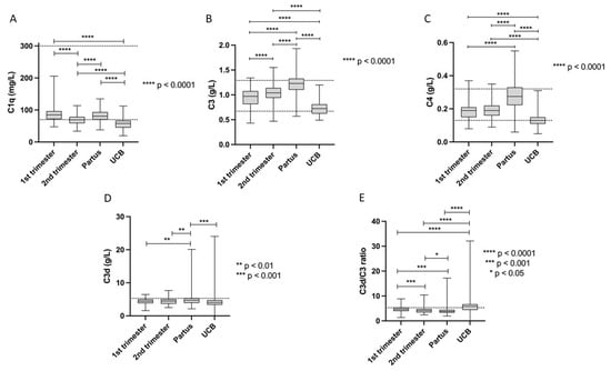 (A–E) Complement protein levels in maternal plasma during different stages of pregnancy and in umbilical cord blood (UCB). Dotted lines indicate reference limits used in clinical routine. Boxes show the 25th to 75th percentile, with median values marked inside. The provided p values are Bonferroni-adjusted.