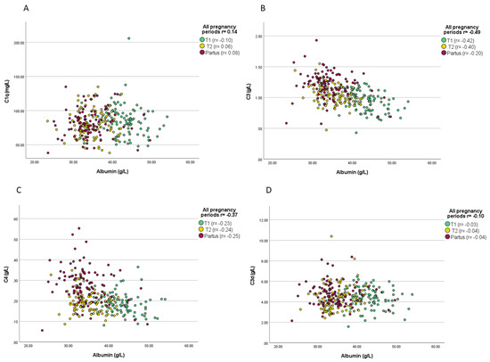 Plasma albumin correlated repeatedly and significantly in all periods of pregnancy with both C3 and C4 levels and with C3d/C3 ratio in T1. In addition, albumin levels were slightly below the normal limit during T1 and T2. It is well established that plasma albumin is a known negative acute phase reactant that decreases during infectious and inflammatory conditions [38]. The pregnancy itself normally causes low-grade inflammation, generally represented by elevated levels of C-reactive protein (CRP) in normal and uncomplicated pregnancies [39,40,41]. A recent investigation, performed by our research group on the same study population, found an inverse correlation between plasma albumin and CRP, and CRP levels seemed to be above the normal range limits used for non-pregnant women [28]. In this context, it is worth mentioning that CRP has the potential to activate the CP [42]. However, the positive correlations between plasma albumin and some levels of the complement proteins support a possible association between low-grade inflammation and complement activation during normal pregnancies.