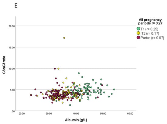 (A–E) Correlations of plasma albumin levels and different complement levels throughout the pregnancies. Correlation coefficients and significance levels are given both for merged data and for all sampling occasions.