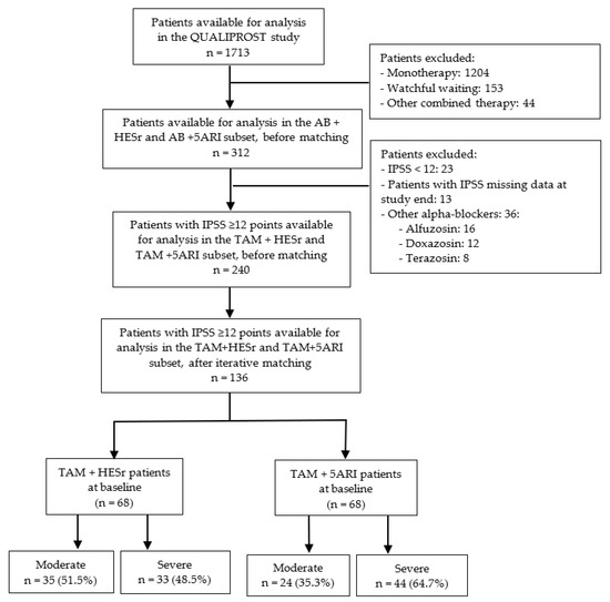 Study flow-chart (iterative matching sample). AB: alpha-blockers; TAM: tamsulosin; 5ARI; 5-alpha-reductase inhibitor; HESr: hexanic extract of Serenoa repens; IPSS: International Prostate Symptom Score.