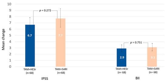 Change scores on symptom and QoL measures were also analyzed by treatment group for patients with more severe baseline symptoms (IPSS > 19). In this subgroup, patients improved by a mean (SD) of 9.2 (5.2) and 9.7 (6.2) points on IPSS (p = 0.678) and by a mean (SD) of 3.5 (2.3) and 3.8 (3.0) points on the BII (p = 0.577) in the TAM + HESr and TAM + 5ARI arms, respectively (Table S3).