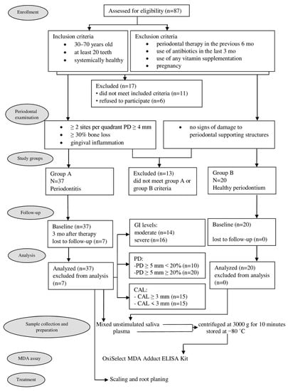 Figure 1. Flow chart of clinical study. GI—gingival index; PD—probing depth; CAL—clinical attachment level; MDA—malondialdehyde.