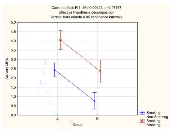 The salivary and plasma MDA levels in smokers were statistically significantly higher than those measured for non-smokers in both groups. Therefore, a factorial ANOVA test was conducted to analyze the average salivary and plasma MDA levels according to study groups and smoking status. The obtained p-values suggest the presence of statistically significant differences in both salivary and plasma MDA between groups, as well as between smokers and non-smokers, but that there is no statistically significant interaction between groups or between smokers and non-smokers (Figure 3 and Figure 4).