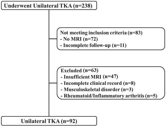 We retrospectively reviewed the medical records of patients who underwent unilateral TKA between July 2019 and February 2021. Inclusion of patients was narrowed down to those who had been subjected to knee magnetic resonance imaging (MRI) before surgery and had a complete postoperative follow-up record 1 year after surgery. Exclusion criteria were: (1) insufficient MRI data that did not cover the distal 10% of the femoral length; (2) incomplete clinical records; (3) the presence of other musculoskeletal disorders that affect the postoperative rehabilitation program; and (4) the presence of rheumatoid or inflammatory arthritis. Finally, 92 patients were included in the study (Figure 1). The demographic characteristics of the study population are shown in Table 1. This study was approved by the institutional review board of our hospital (2021-11-030).