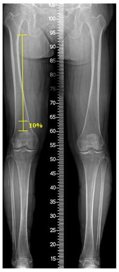Patients underwent MRI (Magnetom Skyra; Siemens Medical Solutions, Erlangen, Germany) with the knee fully extended in the supine position and stabilized by a knee holder. During MRI, the knee joint (between 1/3rd of the distal femur and 1/3rd of the proximal tibia) was fully covered and contained axial slices of proton density (PD) and PD fat suppression at 2 mm intervals. The VM cross-sectional area (CSA) and the fat infiltration (FI) ratio were measured at the distal 10% level of the femoral length. This level has been previously reported to reflect the total quadriceps volume in patients with knee OA []. The femoral length was defined as the length from the distal end of the lesser trochanter to the superior surface of the patella on a full-length standing anteroposterior radiograph (Figure 2). On coronal MRI view, the level was identified from the superior surface of the patella and the corresponding axial slice was matched using 3D indicators of the picture archiving communication system (PACS; M6, Infinitt Healthcare, Republic of Korea). The VM CSA was acquired from the axial PD image after marking the VM margin using the embedded tools of the PACS software. To assess the FI ratio of the VM, the marked area on the PD slice was transferred to the corresponding PD fat-suppression slice and the intramuscular fat signal within the area was confirmed by comparing the PD and PD fat-suppression slices. Thereafter, the area was color-mapped using 16 different colors for each signal. Color pixels corresponding to the signal of the fat tissue were extracted, and the FI ratio was defined as the percentage of the pixels of the fat tissue to the sum of the pixels of VM (Figure 3). The hip–knee–ankle (H–K–A) angle was determined as the angle formed by the mechanical axis of the femur and the tibia on full-length standing anteroposterior (AP) radiographs. To classify the severity of OA, the tibiofemoral joint was evaluated using the Kellgren–Lawrence scale in standing AP and lateral radiographs as follows: grade I, doubtful narrowing of the joint space and possible osteophytic lipping; grade II, definite osteophytes and possible narrowing of the joint space; grade III, moderate multiple osteophytes and definite narrowing of the joint space; and grade IV, large osteophytes-marked narrowing of the joint space [].