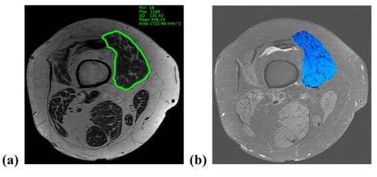 - Morse, C.I.; Degens, H.; Jones, D.A. The validity of estimating quadriceps volume from single MRI cross-sections in young men. Eur. J. Appl. Physiol. 2007, 100, 267–274. [Google Scholar] [CrossRef] [PubMed]