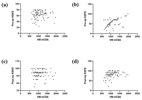 Scatter plots of the univariate relationship between CSA and (a) preoperative Knee Society knee score (KSKS); (b) preoperative Knee Society functional score (KSFS); (c) postoperative KSKS; (d) and postoperative KSFS.
