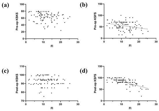 Scatter plots of the univariate relationship between FI ratio and (a) preoperative KSKS; (b) preoperative KSFS; (c) postoperative KSKS; (d) and postoperative KSFS.