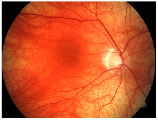 Typical sunset glow fundus of one patient included in the study: diffuse orange-red discoloration of the fundus with peripapillary atrophy and mottling of the pigment epithelium in the macular region.