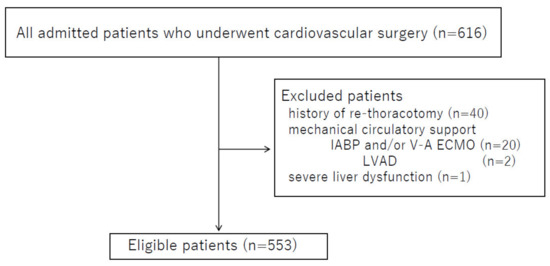 Using our institute’s database of patients admitted to the intensive care unit (ICU) between January 2016 and December 2017, we selected patients who underwent cardiovascular surgery according to the following exclusion criteria: age < 18 years, severe liver dysfunction, use of mechanical circulatory support (e.g., intra-aortic balloon pumping (IABP), venous-arterial extracorporeal membrane oxygenation (V-A ECMO), left ventricular assist device (LVAD)), and history of re-thoracotomy due to bleeding or cardiac tamponade.