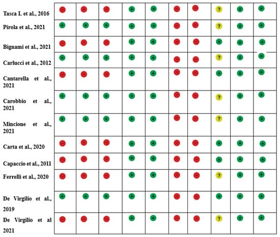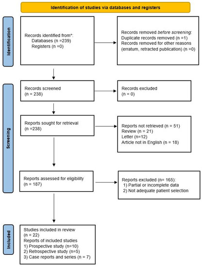 The systematic review of the literature identified 239 potentially relevant studies (Figure 1). After removing duplicates and applying the criteria listed above, 187 records were potentially relevant to the topic. Through the analysis of records and subsequent full-text screening of the articles, we excluded all the studies that did not match the inclusion criteria (n = 156). The remaining 22 papers were included in a qualitative synthesis for data extraction [1,2,4,5,14,15,16,17,18,19,20,21,22,23,24,25,26,27,28,29,30,31]. Moreover, according to the criteria established for meta-analysis, a quantitative analysis was not performed. A graphical display of bias analysis outcomes is shown in Figure 2, summarizing the possible risk of bias.