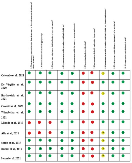 Risk of Bias summary of authors’ judgments for each study, assessed by the Joanna Briggs Institute (J.B.I.) Critical Appraisal Checklist for Case-Control studies [1,2,4,5,14,15,16,17,18,19,20,21,22,23,24,25,26,27,28,29,30,31].
