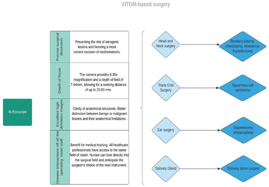 Over the last decade, technological growth has developed new devices for more precise surgery based on improved maneuverability, minimally invasive approaches, and magnification of the operating field. In this context, the exoscope has opened a new phase for more accurate and safer microsurgery, improving the perception of the volume of objects and the depth of structures for planning, targeting, and controlling fine movements. The exoscope could be used for middle ear, transcanal, transmastoid, and craniotomy procedures that require two-handed dissection, both to perform both totally VITOM-based techniques and coupled to traditional procedures with an operating microscope or endoscope. In addition, the VITOM 3D system allows the surgeon to work with high-definition images, which is essential in facial nerve surgery or submandibular salivary stone or tear surgery approaches, where magnification plays a fundamental role in surgical success and in reducing operating times. The 3D exoscope approach could also be included in traditional transoral procedures for oropharyngeal carcinoma. The exoscope may provide a relevant approach in teaching surgeons and nurses, allowing adequate training in non-oncological surgical procedures such as a tonsillectomy or lateral pharyngoplasty.