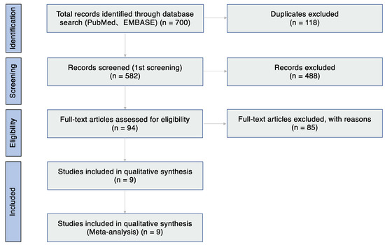 The database search identified 700 articles. After removing 118 duplicates, 582 articles were reviewed based on the title and abstract. Of these articles, 488 studies were excluded because of the article type (clinical guidelines, consensus documents, reviews, and conference proceedings) and because they focused on other subtypes of AC (atopic keratoconjunctivitis, vernal keratoconjunctivitis, giant papillary conjunctivitis, and atopic blepharitis), had an animal-based design, focused on other unrelated topics and drug allergy, and were not written in English (Table 1). Thus, 94 articles were assessed for eligibility (Figure 1), and eventually, studies on nine studies met the inclusion criteria and were included in the systematic review (Table 2).