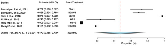 Using the one-group meta-analysis in a random-effects model, six studies that included 1932 individuals were further analyzed for the incidence rate of DE among individuals with AC (Figure 2); the results revealed that 47.2% (95% confidence interval: 0.165–0.779; 320/1932 cases) of patients with AC had DE.