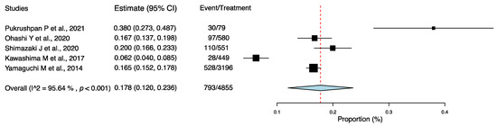 Using the one-group meta-analysis in a random-effects model, five studies that included 4855 subjects were further analyzed for the incidence rate of AC among individuals with DE (Figure 3); the results revealed that 17.8% (95% confidence interval: 0.120–0.236; 793/4855 cases) of patients with DE had AC.