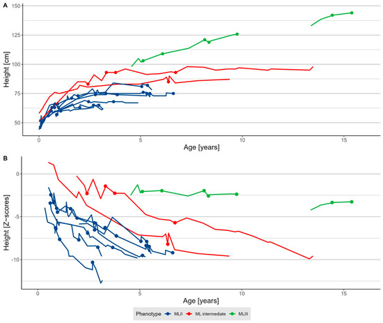 All of the MLII and intermediate patients presented severe growth failure. In MLII, vertical growth was only observed in infancy and in ML intermediate within the first three years of life (Figure 1 and Figure S1). Marginal means calculated from the mixed model showed a substantial height difference at the age of five years. Patients with MLII reached a mean, presumably maximum height of 73 cm (CI 69.4–76.6), and those with ML intermediate, a mean, presumably maximum height of 88.4 cm (CI 81.8–95). In contrast, the growth velocity of MLIII patients slowed down during childhood but did not cease. The mean height of MLIII patients was 104 cm (CI 97.5–111) at five years and 143 cm (CI 137.8–148.9) at 18 years of age.
