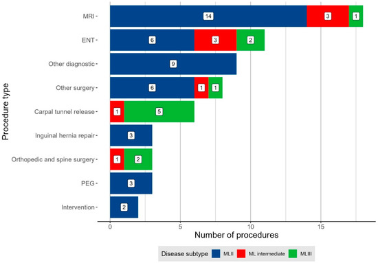 Two or more procedures were frequently combined within one anaesthesia. Anaesthesia was mainly performed for diagnostics (27/60; 45%; i.e., MRI n = 18; BERA n = 6; CT n = 1; ophthalmological and neurophysiological examinations n = 2). The most common surgical indications for anaesthesia were ear, nose, and throat (ENT) surgeries (11/60; 18%), carpal tunnel release (6/60; 10%), and hernia repair (3/60; 5%). Three quarters (9/12) of all ML patients underwent at least one ENT surgery. Carpal tunnel release was mainly performed in MLIII and hernia repair exclusively in MLII (Figure 2).