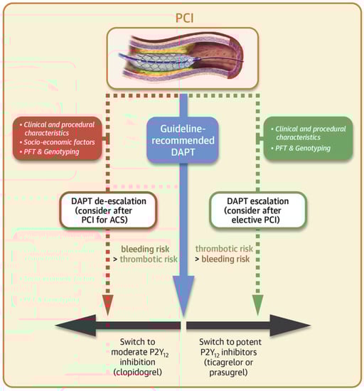 Considerations when implementing DAPT in relation to PCI; PFTs (such as thromboelastography) can guide escalation/de-escalation of therapy. Reproduced with permission from Sibbing D. et al., JACC Cardiovasc Interv 2019 []. ACS: acute coronary syndrome; DAPT: dual antiplatelet therapy; PCI: percutaneous coronary intervention; PFT: platelet function tests.