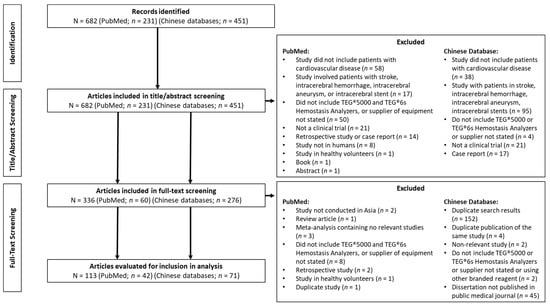 In total, 231 articles were identified in PubMed, plus a further 451 in the 3 Chinese databases; the PRISMA flow diagram is shown in Figure 2. After screening based on the title and abstract against the inclusion/exclusion criteria (Table 1), 60 articles were identified in PubMed, and 276 articles were identified in the Chinese databases for full-text review. Of these, 153 duplicate articles were removed leaving 42 PubMed and 71 Chinese database articles that met the pre-defined inclusion criteria, which included 38 randomized controlled trials (RCTs) where patients were randomized either to different therapies or treatment algorithms based on thromboelastography use. No meta-analyses were identified (Table S2).