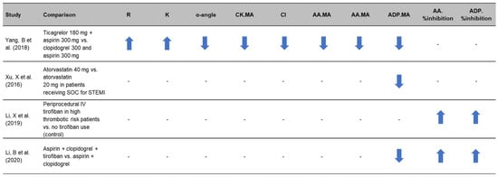 Several studies from East Asian centers have shown that thromboelastography platelet function parameters are affected by different treatment regimens (Figure 3) [,,,]. In one single-center RCT, 120 patients undergoing emergency PCI following an acute myocardial infarction (AMI) were perioperatively assessed following infusion with either ticagrelor or clopidogrel []. Measurement of thromboelastography parameters showed that ticagrelor can improve antiplatelet response in patients with AMI during the perioperative period of emergency PCI without increasing bleeding risk as shown by lower parameters including α-angle, CK.MA [citrated kaolin], ADP.MA and AA.MA (p < 0.05) []. In a further RCT of 120 acute STEMI patients after emergency PCI, ADP.MA determined by thromboelastography was used to investigate the effects of different doses of atorvastatin on plasma endothelin and platelet function []. The ADP.MA in the group receiving 40 mg of atorvastatin (intensive group, n = 60) was shown to be significantly lower than the group receiving 20 mg of atorvastatin (standard group, n = 60) after treatment: 38.4 ± 17.4 mm vs. 45.7 ± 14.5 mm, respectively, p < 0.05. The authors conclude that high intensity atorvastatin therapy during PCI reduces plasma endothelin, improves endothelial function and reduces residual platelet activity [].