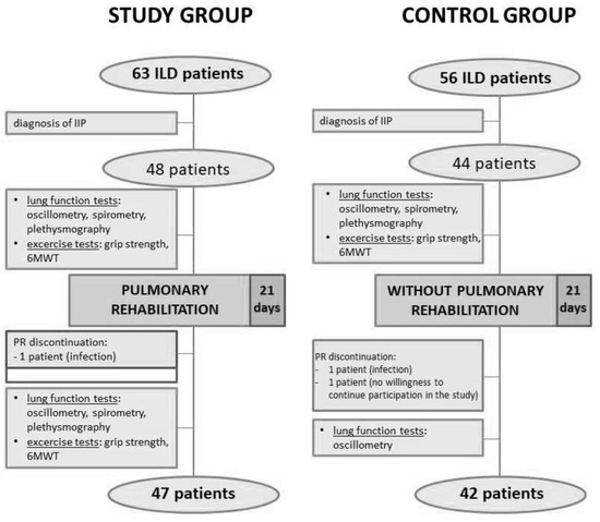 Forty-eight patients with IIP (30 patients with IPF, 9 patients with NSIP and 9 patients with unclassifiable interstitial pneumonia) were recruited between September 2018 and February 2020 to the inpatient rehabilitation program at the Department of Lung Diseases and Tuberculosis, the Medical University of Silesia in Katowice. The control group consisted of 44 patients with IIP (28 patients with IPF and 16 patients with unclassifiable interstitial pneumonia) who did not undergo PR. The study was designed as an intervention non-randomized study with lung function and exercise tests performed before and after 3-week pulmonary rehabilitation/interval. The studied group was created from participants admitted to the pulmonary rehabilitation ward while the control group consisted of corresponding patients admitted to the lung diseases ward or to the hospital out-patient clinic, awaiting pulmonary rehabilitation (the average waiting time in Poland is about one year). Approval was obtained from the Bioethics Committee of the Medical University of Silesia in Katowice (Act No. KNW/0022/KB1/85/I/17 from 19 December 2017) and was conducted in accordance with the Declaration of Helsinki. All patients provided written informed consent. The research was registered in the ISRCTN Trials Registry (ISRCTN31987937). The inclusion criteria were as follows: (1) written informed consent provided by all patients, (2) diagnosis of IIP based on the European Respiratory Society/American Thoracic Society (ERS/ATS) and Polish criteria [1,39,40,41], (3) a stable period of illness without infection/exacerbation during the previous 4 weeks, (4) a distance in 6MWT of over 250 m, (5) and an ability and willingness to perform physical activity.