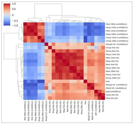 Correlation coefficients between particular resistance and reactance values based on the order of the hierarchical clustering. R, resistance; X, reactance; insp, inspiratory; exp, expiratory; tot, total; ∆X5, expiratory flow limitation; Fres, resonant frequency.