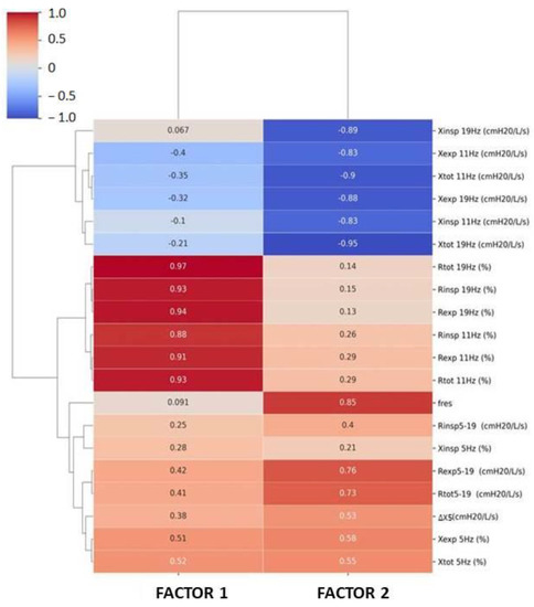 Factor analysis of baseline FOT measurements in rehabilitated patients with IIP was performed. To maximize the variance, varimax normalized rotation was applied. From all FOT results, we separated two factors (Factors 1 and 2) that reflected 75.3% of the total variance (Table 5). Factor loads are presented in Figure 3. These loads represent correlations between the factor value and individual FOT measurements (a value closer to 1 or −1 corresponds to a stronger positive/negative correlation). It can therefore be concluded that Factor 1 mostly represents resistance values, while Factor 2 reflects reactance and Fres values. Further analysis was performed with the use of the eigenvalues of Factors 1 and 2 (Table 6).