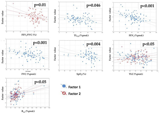 Based on factor analysis, we found that Factor 2 was negatively correlated with FVC and TLC and positively correlated with Raw (Table 6, Figure 4). This indicates coherence of these parameters, as lower (more disturbed) reactance and Fres were related to lower FVC and TLC and higher Raw. These findings are in concordance with a recent report by Ram et al. [75], who found that resistance, as measured by FOT and with plethysmography, was physically and numerically similar. In contrast, Hellinckx et al. [76] observed that FOT underestimated high resistance values. Concurrently, Meier-Sydow et al. [77] noticed that airway resistance measured by plethysmography was increased in patients with pulmonary fibrosis due to ventilatory inhomogeneity in fibrotic areas and showed a deteriorating tendency with time in one-third of patients. In our study, we did not observe an influence of PR on the plethysmography results.