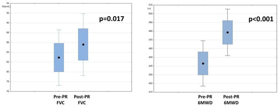Another interesting finding is the significant improvement in FVC (p = 0.017, Table 7, Figure 5). There are conflicting reports about the influence of PR on FVC in ILD patients; a number of studies have demonstrated improvements [5,7], while others have demonstrated no impact [12,13,55]. Our study suggests that PR may have a positive impact on FVC. This is extremely important considering the fact that some studies emphasize survival prediction based on a deterioration in FVC [71]. As mentioned earlier, an indispensable part of the course of IIP is the progressive deterioration of lung function, even despite therapy with pirfenidone and nintedanib, which decrease the rate of decline in lung function [9,51,52,53,54]. Therefore, finding a way to prevent FVC worsening appears to be one of the most important elements of complex IIP patient therapy. In this area, PR turns out to be promising.