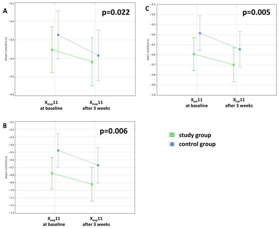 3-week deterioration in reactance at 11 Hz (X11) in the study and control groups, (A) inspiratory (insp), (B) expiratory (exp) and (C) total (tot), respectively.