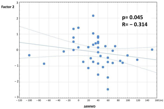 Relationship between Factor 2 and change in the 6MWD (∆6MWD) in the study group. Factor values were obtained by factor analysis of baseline FOT measurements in rehabilitated patients. Factor 2 reflects mostly reactance and Fres values (see Figure 3).