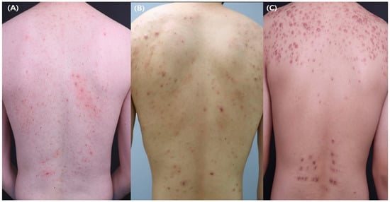 The prevalence of truncal acne has not yet been well established to date. Previous studies report that about 48–52% of facial acne patients also have truncal acne [4,5,6]. In 2007, Del Rosso et al. [4] examined 696 patients aged 14 to 20 years with acne and found that 52.3% exhibited truncal involvement. Among them, 10.6% showed truncal acne scarring [4]. Isaacsson et al. [5] reported that 50% of Brazilian adolescents had acne on their chest or back. A large-scale international study of 2926 adult females found that 48.8% of the patients with facial acne also had truncal acne [6]. Recently, Dreno et al. reported that a family history of acne was associated with the extension of acne to the trunk [7].