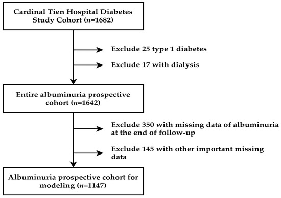 Data for this study were obtained from the diabetic outpatient clinic of the Cardinal Tien Hospital in Taiwan from 2013 to 2019. This study is a prospective study, as we have collected our patients from 2013 to 2016. We designated this cohort as the Cardinal Tien Diabetes Study Cohort. Informed consent was obtained from all participants, and data were collected anonymously. The study protocol was approved by the Institutional Review Board of the hospital. In total, 1682 T2D patients were enrolled. After excluding subjects with different causes, 1147 subjects remained for analysis (women: 608, men: 539), as shown in Figure 1. They were followed up for 4 years. The following were the criteria for inclusion: (1) type 2 diabetes; (2) age between 50 and 75 years; (3) body mass in the range of 22–30 kg/m2; (4) glycated hemoglobin level between 6.5 and 10.5%; (5) the patients did not undergo regular dialysis. A flowchart of participant selection is displayed in Figure 1.