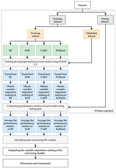 A flowchart of the proposed prediction and important variable identification scheme that combines the four ML methods is shown in Figure 2. First, patient data were collected using the proposed method to prepare the dataset. The dataset was then randomly divided into an 80% training dataset for model building and a 20% testing dataset for model testing. In the training process, each ML method has its hyperparameters that must be tuned to construct a relatively well-performed model. In this study, a 10-fold cross-validation (CV) technique for hyperparameter tuning was used. The training dataset was further randomly divided into a training dataset to build the model with a different set of hyperparameters and a validation dataset for model validation. All possible combinations of the hyperparameters were investigated using a grid search. The model with the lowest root mean square error for the validation dataset was viewed as the best model for each ML method. The best turned RF, SGB, CART, and XGBoost models were generated, and the corresponding variable importance ranking information was obtained.