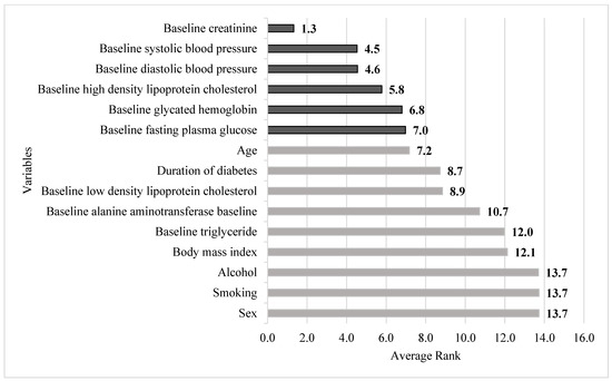 Interestingly, in the present study, the duration of diabetes, body mass index, sex, smoking, and alcohol use were less important. This finding could be attributed to the nature of the ML. ML methods are data-driven, non-parametric models. They can map any nonlinear function without an a priori assumption about the properties of the data and have the ability to capture subtle functional relationships among the empirical data, even though the underlying relationships are unknown or difficult to describe [68,69,70]. These factors may contain richer linear pattern information and less important nonlinear information than baseline creatinine, blood pressure, albuminuria level, and age. Thus, they were ranked as less important risk factors using ML methods.