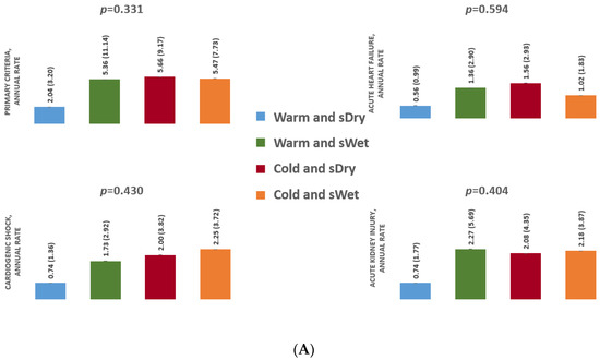 The rate of primary criteria was 2.04, 5.36, 5.66, and 5.47 for “Warm and pDry”, “Warm and pWet”, “Cold and pDry”, and “Cold and pWet” profiles, respectively (p = 0.331). There was also no difference between the four groups in the rate of acute heart failure (p = 0.594), cardiogenic shock (p = 0.430), or acute kidney injury (p = 0.404) (Figure 1A).