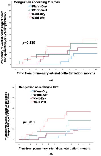 The percentage of waitlist death, emergency HT, or LVAD implantation at 12 months was 36.0%, 26.3%, 22.2%, and 13.2% in “Cold and pWet”, “Warm and pWet”, “Cold and pDry”, and “Warm and pDry” profiles, respectively (p = 0.189) (Figure 2A). Forrester’s profile according to pulmonary congestion were not significantly associated with the risk of one-year waitlist death, urgent heart transplant, or LVAD implantation in multivariate analysis (Supplemental Table S1).