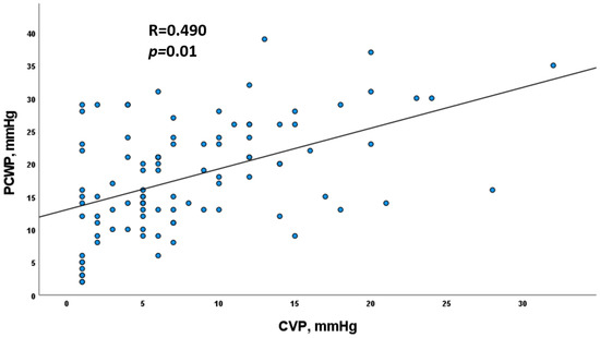 Correlation between PCWP and CVP was good, and Pearson correlation was 0.490 (p = 0.01) (Figure 3). Correlation was good for patients without pulmonary congestion; they were free from systemic congestion in 82.7% and 77.8% for “Warm” and “Cold” profiles, respectively. On the other hand, correlation was weaker when patients had pulmonary congestion. Indeed, in pulmonary congestive patients, systemic congestion was found only in 53% of the “Warm” profile and 40% of the “Cold” profile.