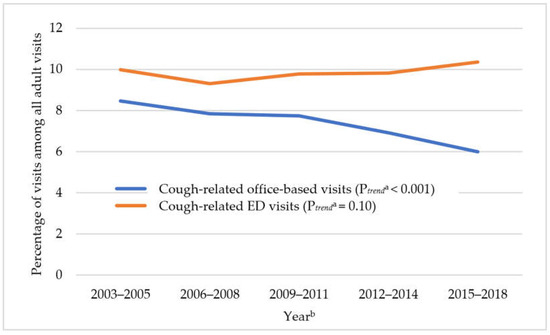 The decreasing trend in cough-related office-based visits in our study may be partially explained by improvement in patient awareness and perceptions about appropriate antibiotic use for URTIs and their self-management of URTIs, most of which do not require office visits nor the use of antibiotics or other prescriptions [32]. However, the decrease in cough-related office-based visits did not affect the cough-related ED visits, which accounted for approximately 10% of overall adult ED visits during the study period. A study of 2016 data using Healthcare Cost and Utilization Project’s (HCUP) National Emergency Department Sample (NEDS) data, found that the second most common reason for ED visits was URTIs [33]. Although the NHAMCS data do not include urgent care centers, the decrease in cough-related office-based visits may be attributable to an increasing trend in urgent care use. A recent study reported a 32.5% increase in urgent care visits with respiratory conditions from 2008 to 2015 [34].