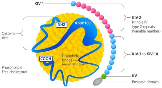 Kringle domains play an important role in blood coagulation. The Lp(a) molecule contains a copy of the plasminogen Kringle V domain and 10 types of Kringle IV domains (1–10) with Kringle IV type 2 repeated in multiple copies. The number of Kringle IV type 2 repeats determines the isoform size and mass of Lp(a) [8]. The higher the molecular mass, the slower the rate of apo(a) production, and, therefore, individuals with a lower molecular mass of apo(a) have higher serum Lp(a) levels [9]. Patients with a high concentration of the smaller Lp(a) isoform and, therefore, fewer copies of Kringle IV type 2 repeats exhibit high cardiovascular risk. Given its specific and unique structure, the pathogenic role of Lp(a) has been thought to promote atherosclerosis (due to its similarity with LDL) and thrombosis due to its structural similarity with plasminogen [10]. Moreover, investigators have also reported a role of Lp(a) in angiogenesis, wound healing, and tumor growth.