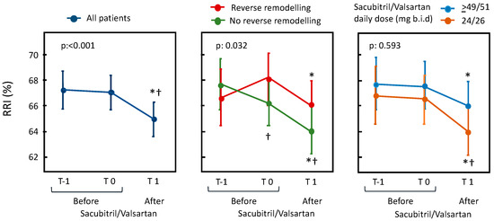 In the left panel, changes in RRI before and after sacubitril/valsartan are presented. In the right panels, changes are presented depending on the occurrence of reverse remodeling after treatment with sacubitril/valsartan and on its dosage. The data are expressed as the mean and 95% confidence interval with a linear mixed model adjusted for repeated measures. p refers to the statistical significance of the model; * p < 0.05 vs. T0, † p < 0.05 vs. T-1.