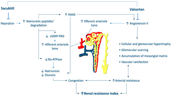 In order to better clarify the effects on the renal blood flow, the aim of this study was to evaluate the variation in the renal resistance index (RRI) after treatment with sacubitril/valsartan.